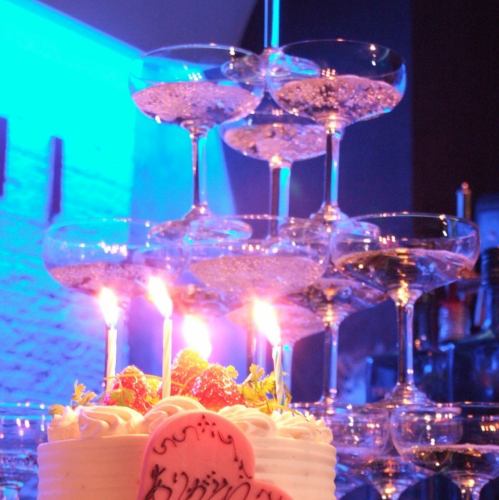 クーポンのケーキorスパークリングワイン1本サービス、どちらか選んで大切なあの人を祝ってあげよう☆シャンパンタワーはパーティを華やかに彩る演出にぜひ。サプライズの演出や会の進行など不安や不明点があっても、色んな飲み会をサポートしてきた心強いスタッフにお任せを☆